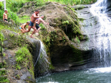 | Condor Waterfalls. Une des nombreuses cascades qui se sont créées sur les flancs des montagnes. L'eau est froide, mais quel bonheur de sauter dans la cuvette de réception qui a près de 6 mètres de profondeur. | En quittant Grenade par le Nord, nous faisons une escale à l'ìle Ronde où nous rejoignons nos amis Anna et Frédéric sur leur catamaran Pinguin. Grégoire, une de leurs connaissances parisiennes les accompagne alors que nous avons Christophe à bord. |