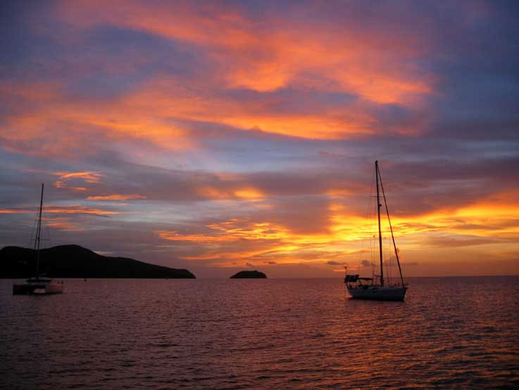 | Anse Mitan. Des conditions météo spéciales. Une mer d'huile alors que les alizés devraient souffler régulièrement. | Des mouillages bien accompagnés. Ici avec Xiphos. |