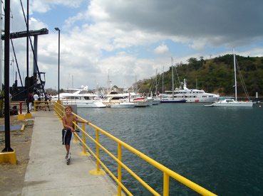 | La Marina du Panama Yacht Club ou Marina de Cristobal. Bien abritée au fond du port commercial et bien située par rapport à la ville de Colon. Nous avons payé 27 US$ par jour et passé de bons moments en compagnie des amis navigateurs, aussi bien au restaurant de la Marina, excellent et bon marché (4 US$ pour la plupart des plats) qu'autour d'un barbecue sur les pelouses. Malheureusement, la pollution est extrême avec un incinérateur qui évacue les fumées des ordures à quelques dizaines de mètres des pontons, dans l'axe du vent dominant d'Est. L'avenir de cette marina est incertain. On parle de sa fermeture dans les deux ans et son remplacement par une nouvelle marina à lextrême Nord-Ouest du bassin limité par la grande digue de Colon. Un emplacement complètement excentré. Les voiliers ne sont pas forcément les bienvenus dans cette zone hyper-active. | |