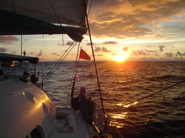 | Les levers de soleil se suivent. Malgré le trafic pratiquement inexistant dans le Pacifique (nous avons croisé 2 barques de pêche la 1ère semaine), nous veillons les nuits. Jacques dort par tranches de 30 minutes, se réveille, contrôle la route, le vent, le radar, et ainsi de suite. Vivianne fait un quart de 03h00 à 06h00. Nous nous sommes très bien habitués à ce rythme. | Quelles que soient les conditions, Benjamin met un harnais de sécurité accroché à nos lignes de vie dès qu'il quitte la zone protégée du cockpit. Comme les manuvres se font en pied de mât, Jacques fait de même pour prendre ou larguer un ris. |