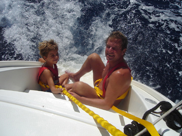 | Le 5ème jour, nous traversons notre premier coup de vent. 35 nuds de SE dans une mer épouvantable. Cet océan n'a que le nom de pacifique. Dès le 7ème jour, nous avons du vent entre 13 et 25 nuds. Nous marchons entre 6 et 10 nuds. Nous naviguons plusieurs jours avec 3 ris dans la grand-voile dans une houle de 4 à 6 mètres. Pendant plus d'une semaine, nous faisons plus de 180 miles par jour, avec un record de 210 miles et une pointe de 14,2 nuds en surfant sur une vague. | Notre jacuzzi au bas des jupes arrière d'Alizé. Accrochés par nos harnais, nous attendons les vagues qui viennent de l'arrière et qui recouvrent fréquemment la dernière marche. Impressionnant, au ras de l'eau avec des creux de 5 mètres. |