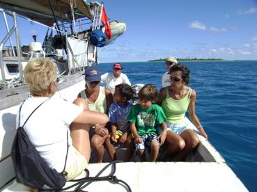 | Le 16 juin 2007 nous montons avec Sophie, Hina et Tetuanui, 5 ans sur Téa pour nous déplacer pour la journée au Nord du lagon où nichent des milliers de sternes dont c'est la période de ponte des oeufs. | |